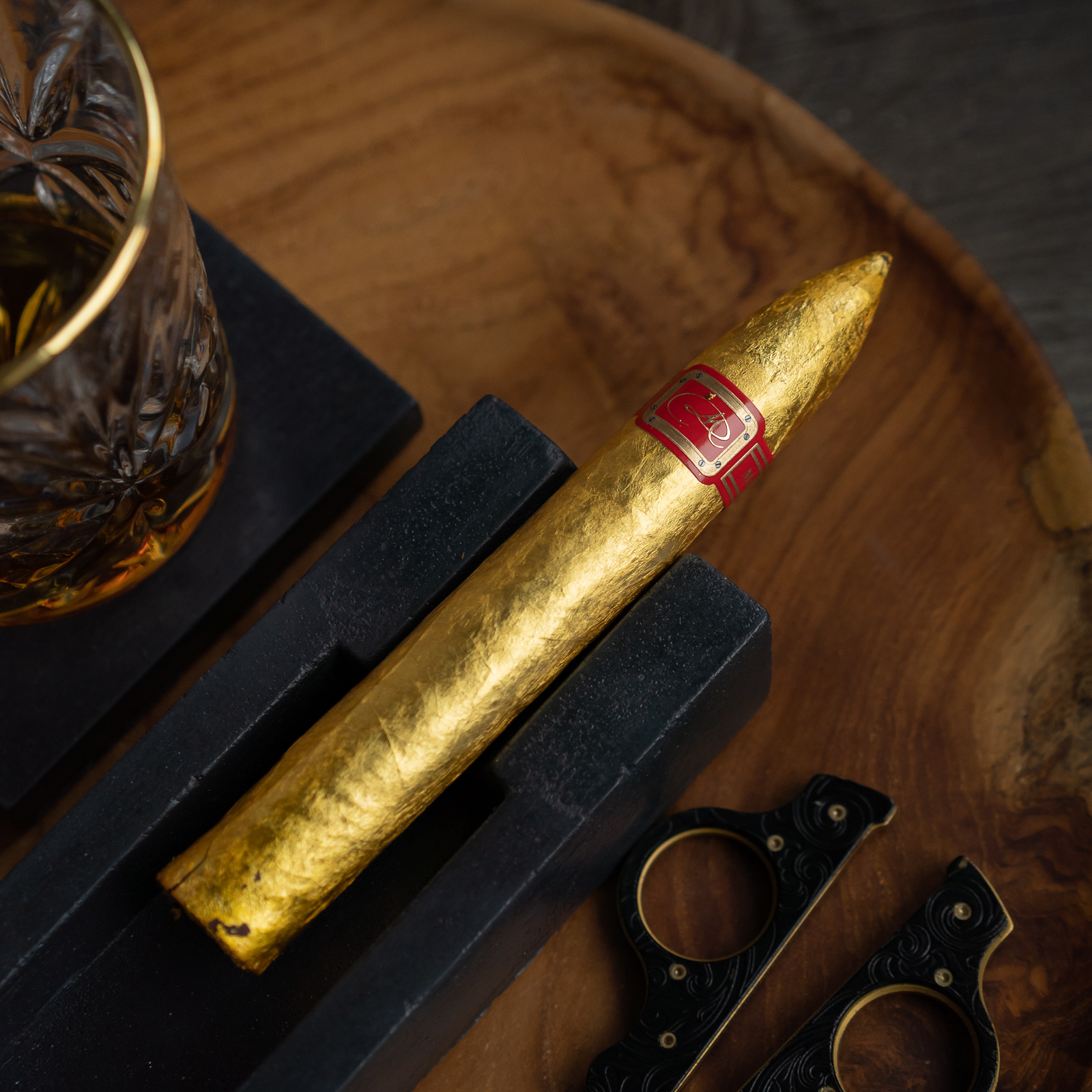 In 2011, famed humidor maker Daniel Marshall custom-made a cigar wrapped in an edible gold leaf, specially designed to celebrate his friend’s 64th birthday. Not too long after, Marshall decided to recreate the golden cigar for an over the top “ultra bling” humidor, which was a project given to him by Universal Studios to commemorate the movie Scarface.