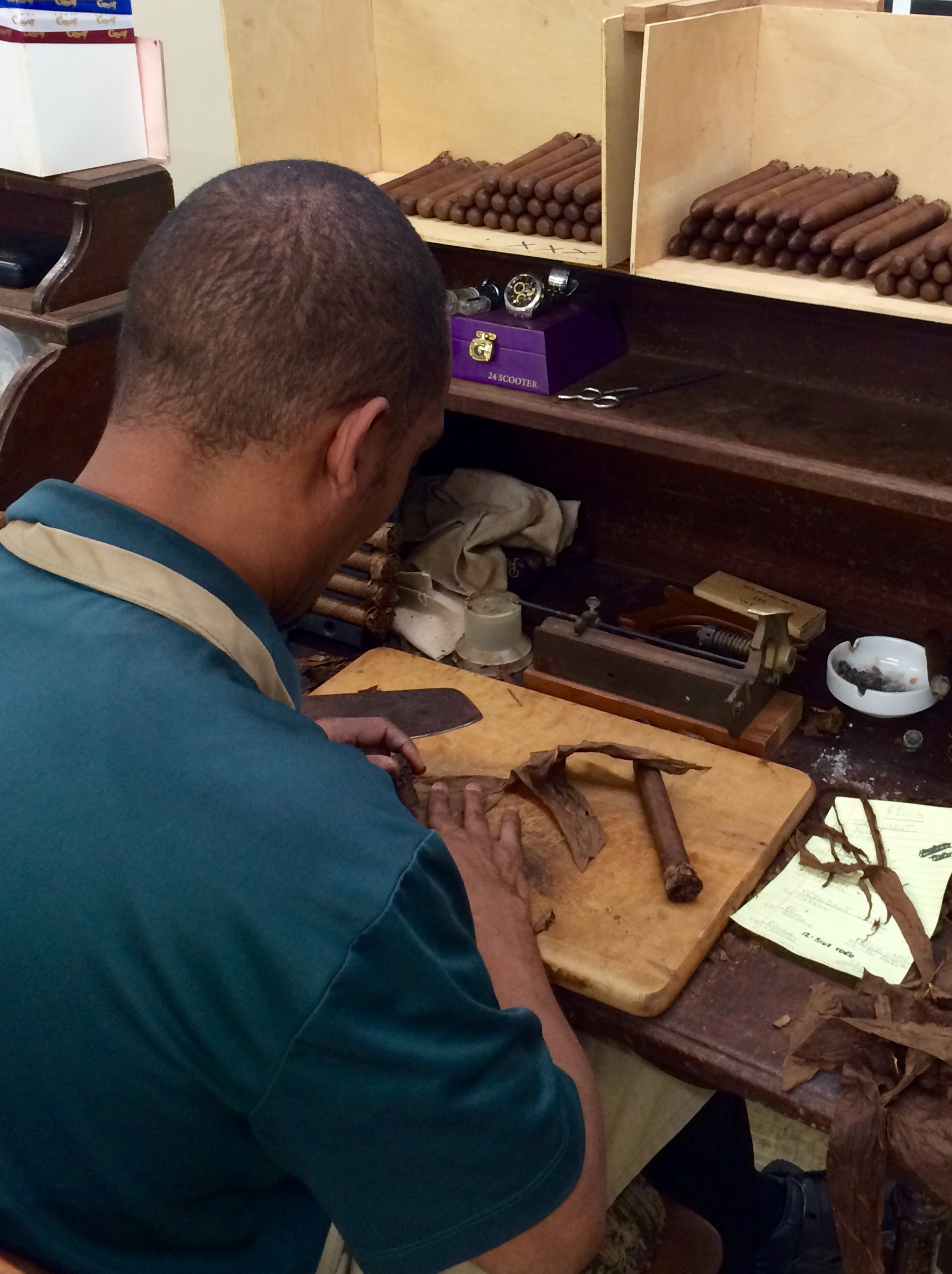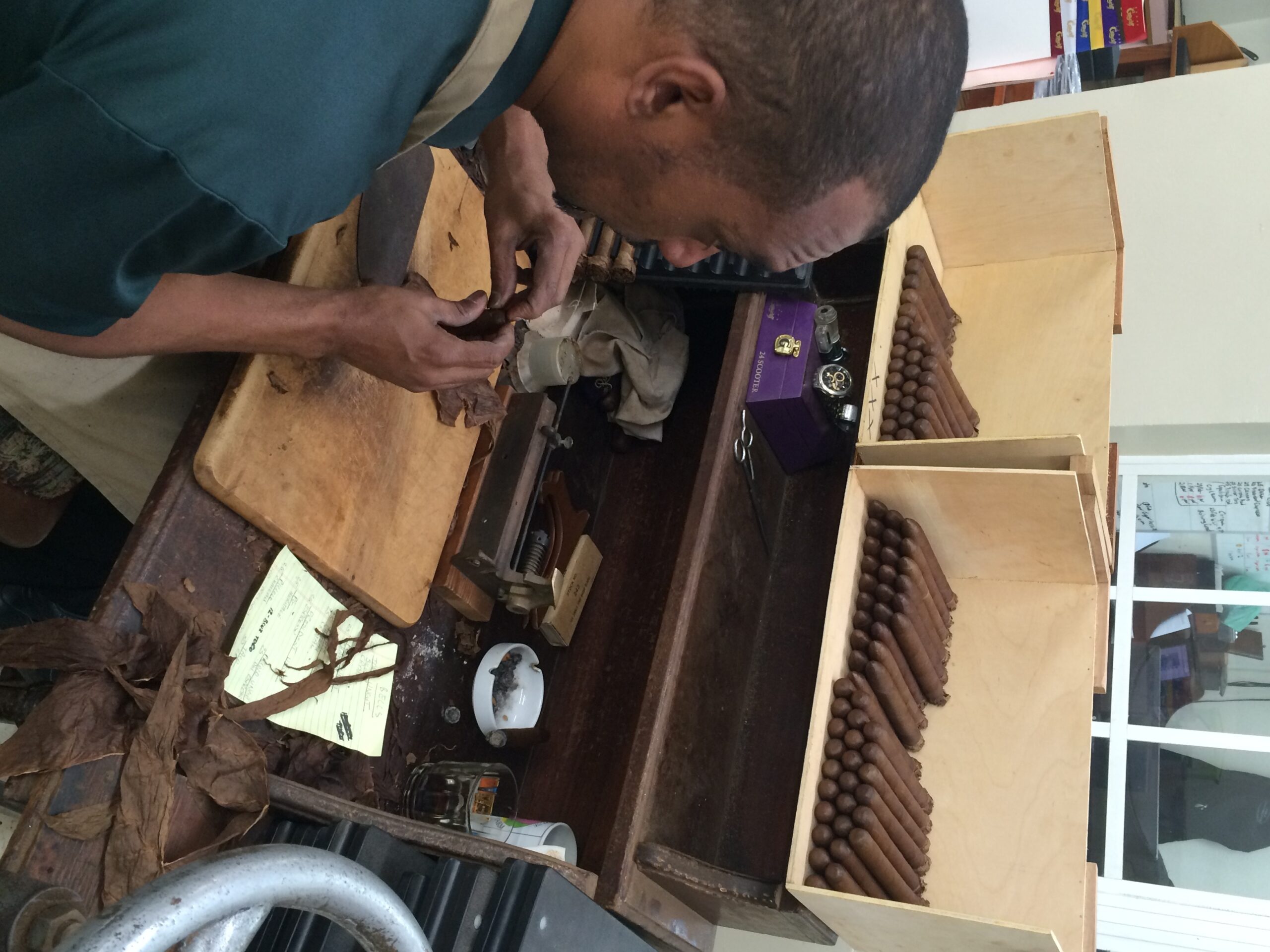 One particular roller that caught my eye was a gentleman rolling what appeared to be a free-form cigar or a cigar without a mold. This is extremely difficult to do as keeping a cigar’s measurements and consistency takes a keen eye and skilled hand. The individual in question was Master Roller Miguel A. Lavadie Duconger who is one of the last free form cigar rollers in the world. As it turns out he was rolling the John Howard Graysmith line which is the ONLY commercial line of cigars dedicated to the free hand cigar rolling style. Miquel makes the cigar using the “Entubado” method which takes the individual filler leaves and rolls them into scroll-like tubes placing them next to each other in the bunch. This method although more time consuming creates more airflow and a better draw and burn making it a more satisfying cigar of very high quality. Watching Mr. Lavadie Duconger work was observing a master at his craft. I’ve visited cigar factories before, seen rollers at their respective tables and even watched rollers attempt free hand cigars but NOTHING like the quality and consistently I saw at the Graycliff Cigar Factory.